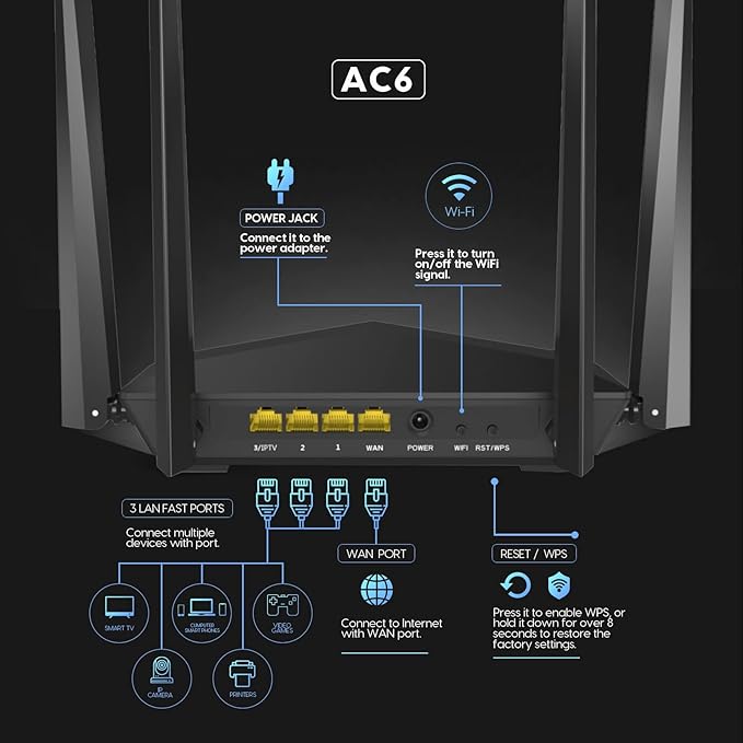 - Wi-Fi 802.11ac : Le Tenda AC6 prend en charge la norme Wi-Fi 802.11ac (également connue sous le nom de Wi-Fi 5), offrant des vitesses de connexion plus élevées par rapport aux normes précédentes.